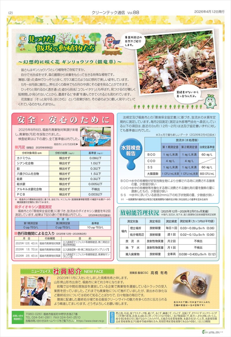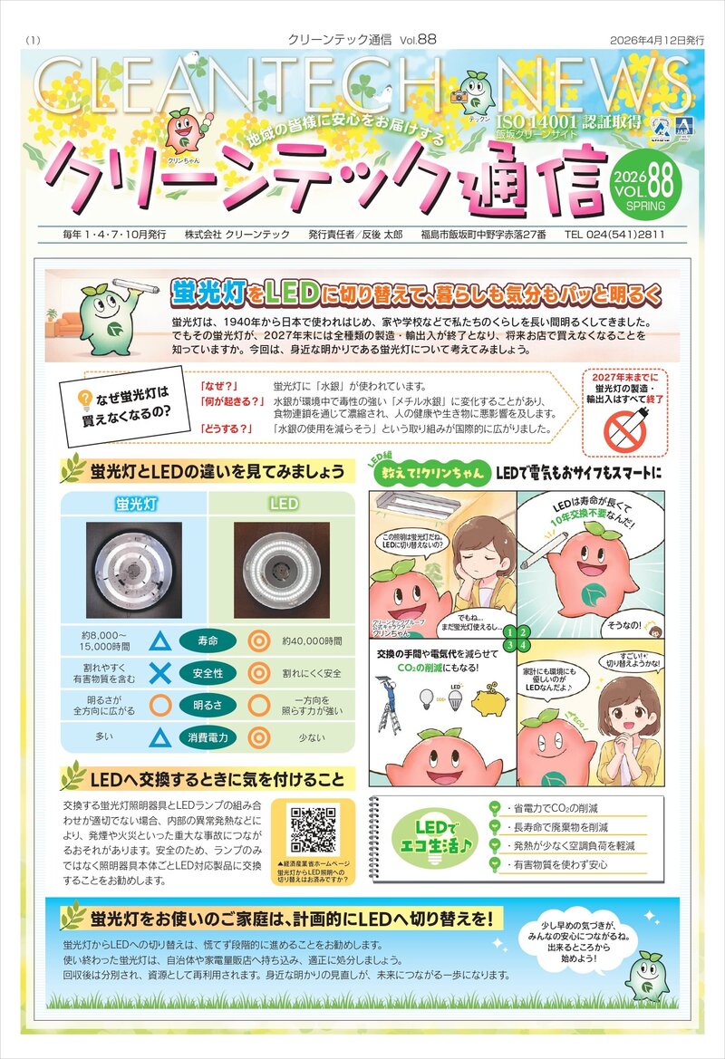 顔の見えるクリーンテック通信を目指し、私たちの取り組み情報・廃棄物の検査結果や水質検査報告、各行政機関による立入り情報など透明性の高い情報を発信しています。また、定期的に身近な環境問題を掲載し、皆さんと環境について考えることができる場を作っています。