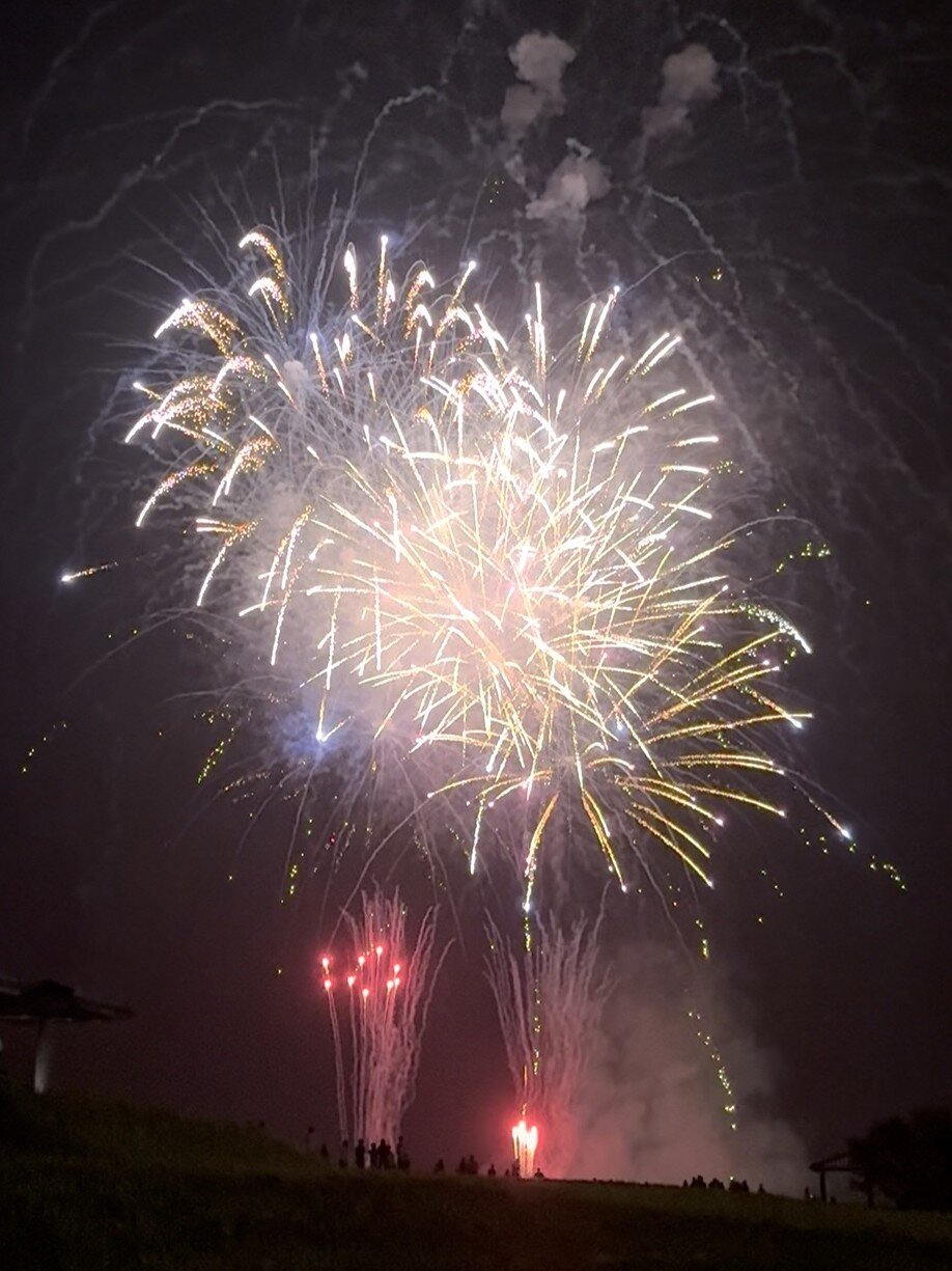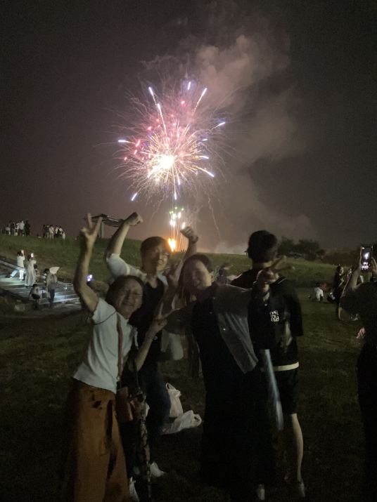 次々と打ちあがる花火を間近で見る迫力と美しさには目を見張るものがありました。色とりどりの花火が、大きな音とともに夜空に広がり、芝生に座るみんなを明るく照らしていました。