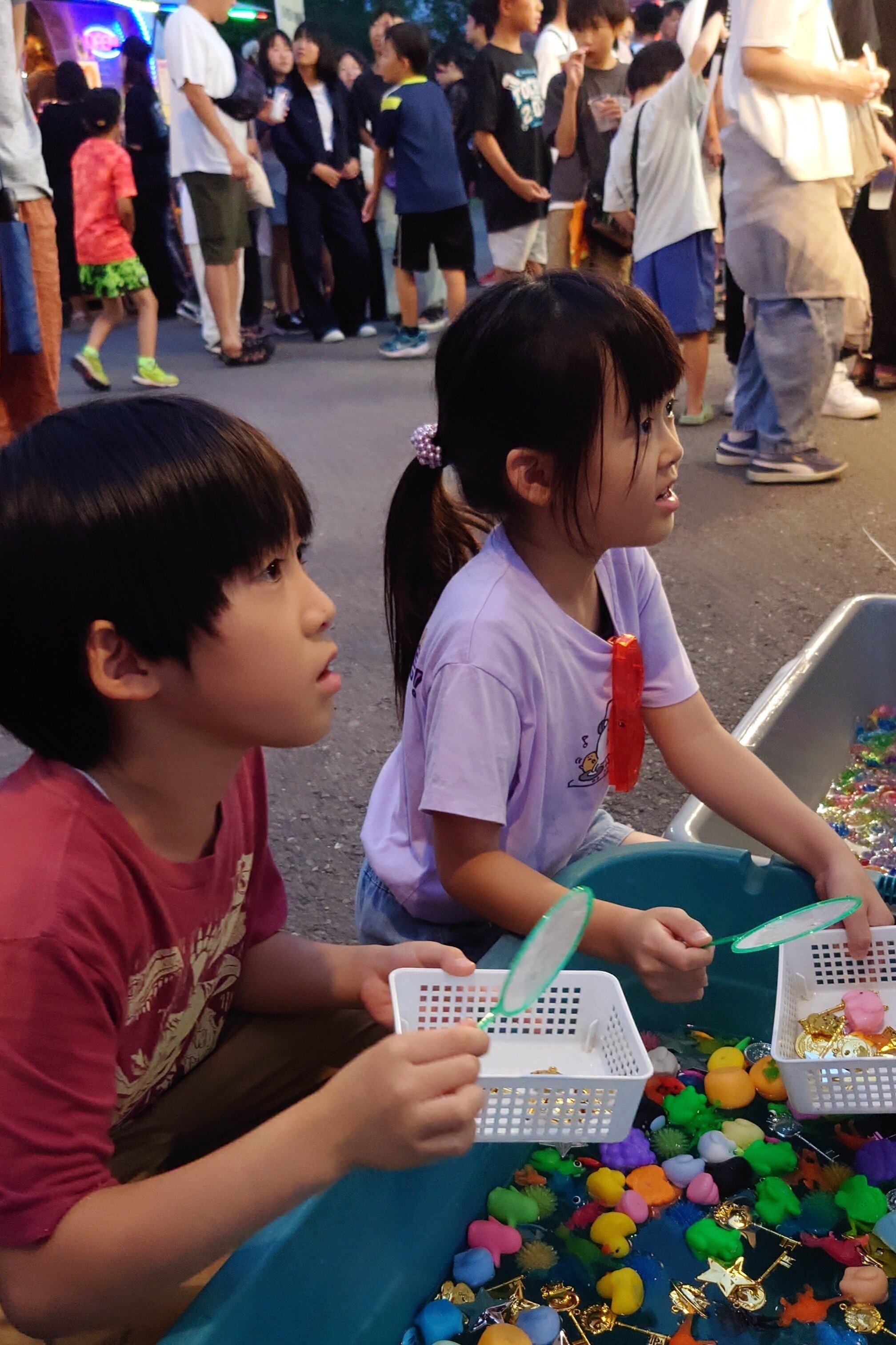 午後5時頃、夢まつり会場に到着。暑すぎず、ちょうどいい気温で快適でした。まずは、いくつかの屋台をのぞきながら何を食べようかと相談。かき氷、ポテト、唐揚げ、たこ焼きなど、ついあれこれ手が伸びてしまう悪い癖が・・・(笑)