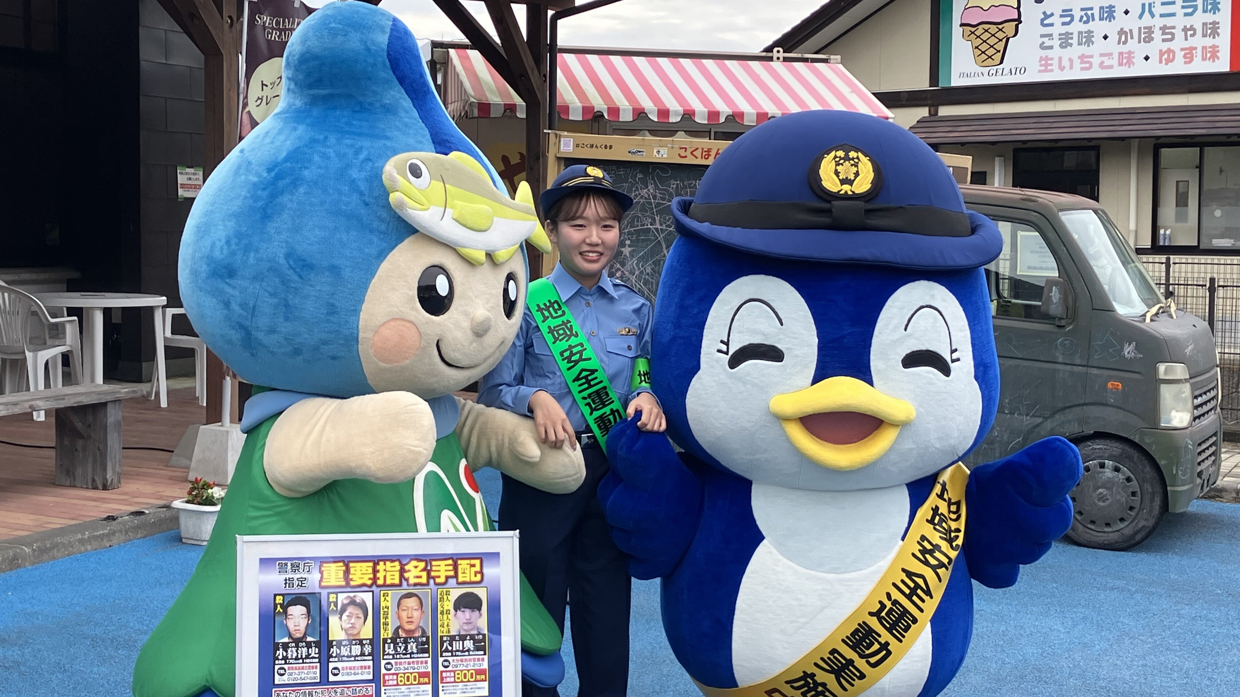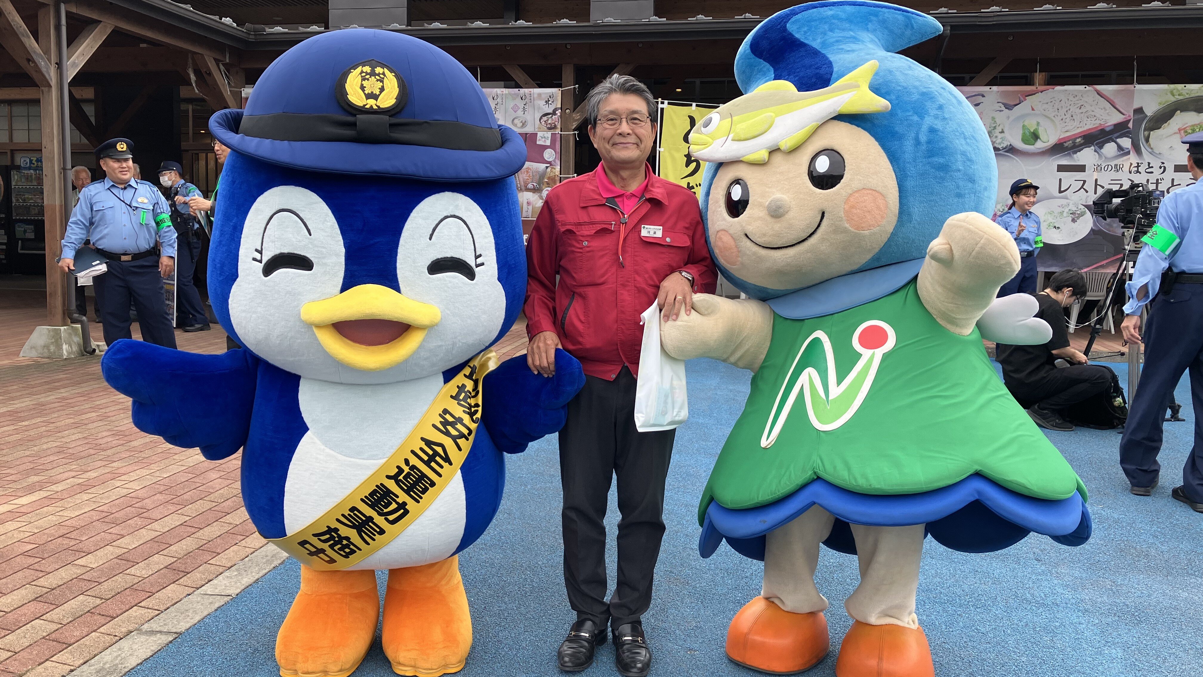 ▲左から、町のイメージキャラクターのなかちゃん、地域おこし協力隊の四ツ谷さん、県警マスコットのルリちゃん