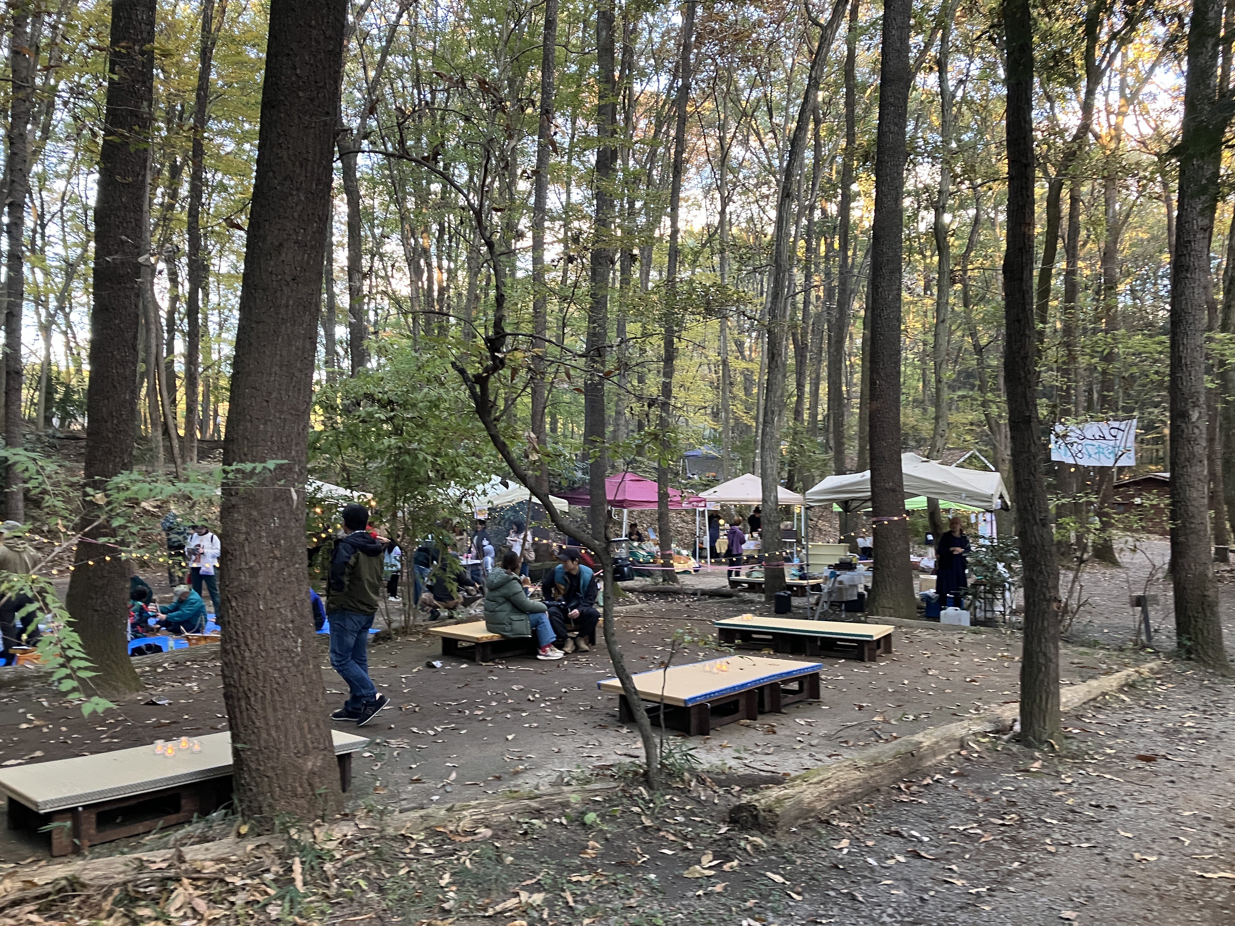 16時頃に会場へ到着すると、森の中の空気は少しひんやりしていましたが、とても心地よく感じました。夕方になるにつれライトアップが始まり、会場全体が幻想的な雰囲気に包まれていきます。光に照らされた森の様子は、まるで物語の世界に迷い込んだかのようで、時間がゆっくりと流れ、日常を忘れて穏やかなひとときを過ごすことができました。マルシェはすべて回りきることができませんでしたが、それもまた来年の楽しみにとっておこうと思います。
