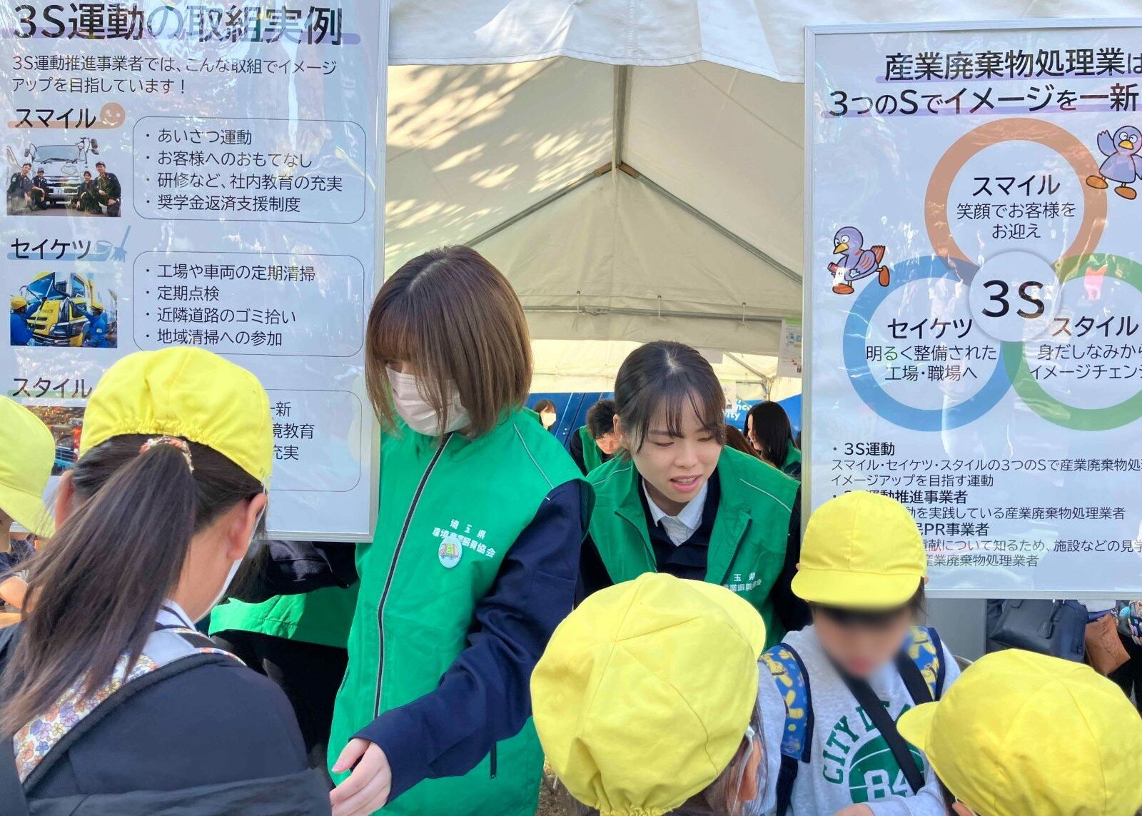 「リサイクル展示品」を食い入るように見る子どもたち。「缶バッジ作成コーナー」で出来上がったバッジを手に喜ぶ子どもたち。「パッカー車の乗車体験コーナー」では自慢げにハンドルを握る小さな運転手さん。「アンケート回答コーナー」はプレゼントのオリジナルハイチューに満面の笑顔!どのコーナーも途切れることのない行列の賑わいでした。立ちっぱなしの足腰をほぐしながらも、子供たちの笑顔に「ヨシッ!」と気合が入ります!!